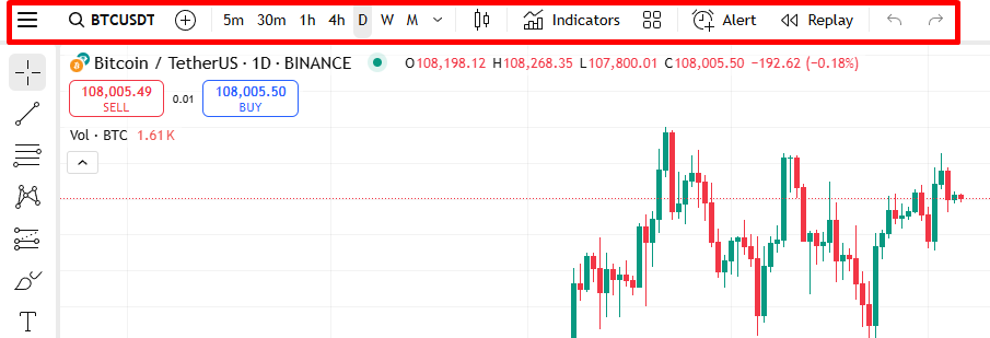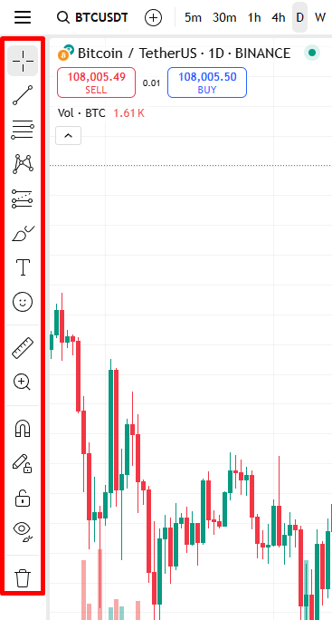 این نوار ابزار شامل تمام ابزارهای رسم و ترسیم نمودار است که مستقیماً در ناحیه نمودار قابل استفاده هستند. از خطوط ساده گرفته تا موقعیتهای بلند/ کوتاه، چیزهای زیادی برای کشف وجود دارد. همچنین میتوانید برای مشاهده مجموعه گستردهای از ابزارها، روی هر ابزار کلیک راست کنید.